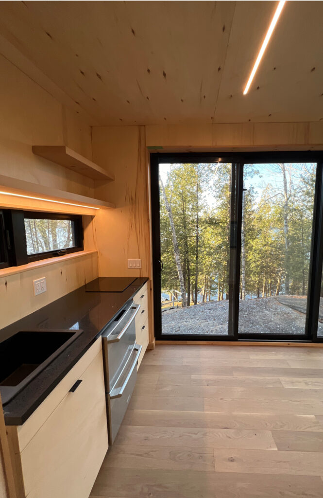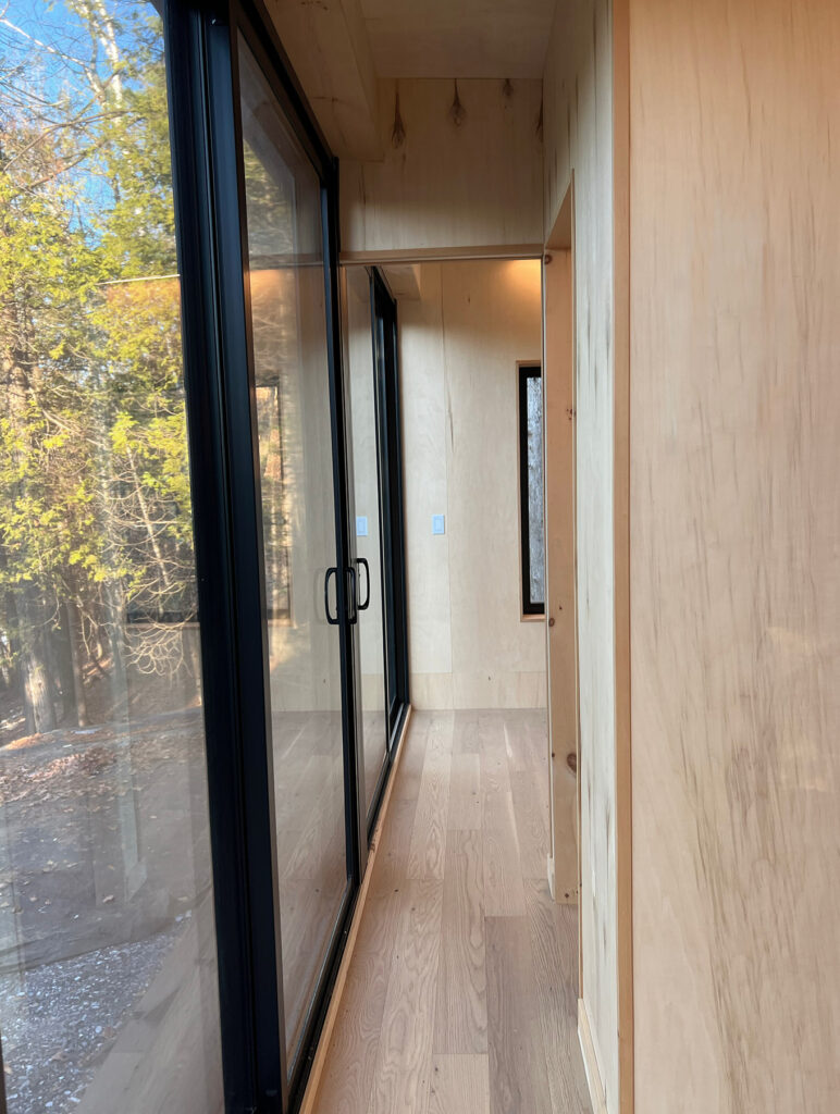 Découvrez une chambre épurée et apaisante, conçue pour la détente. Habillée de bois PurBond naturel et durable, elle allie esthétique scandinave et ambiance québécoise. Les grandes fenêtres en triple vitrage baignent l’espace de lumière et offrant une fenestration écoénergétique.